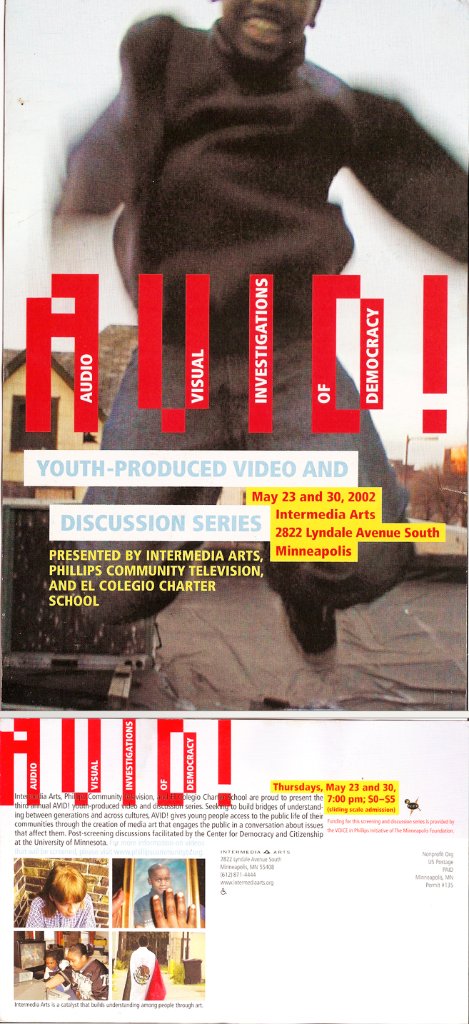AVID! is a media-access program run by Phillips Community Television in conjunction with Intermedia Arts to teach kids in the largely minority and underpriveledged neighborhood of Phillips to shoot and edit short videos.